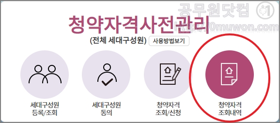 신청절차는 간단합니다. 세대구성원 등록/조회, 세대구성원 동의, 청약자격 조회/신청, 청약자격 신청내역 조회순서 입니다. 순서대로 작성하면 됩니다.