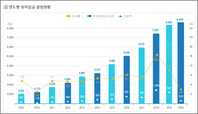 2021년 최저임금은 시급 8720원입니다. 월 환산액으로는 1,822,480원 입니다. 1.5%인상률로 1988년 최저임금 도입 뒤 최저 인상률입니다.
