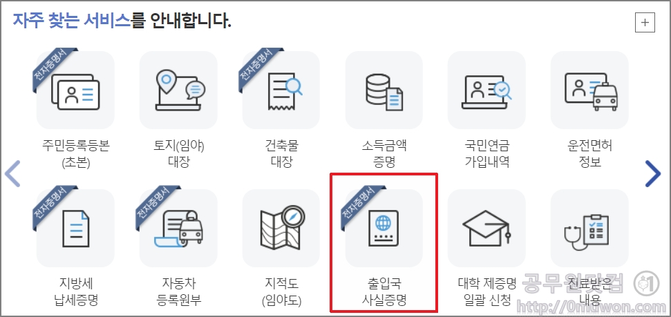 출입국 사실증명서는 정부24에서 발급이 가능합니다. 정부24에서 온라인으로 발급 받기 위해서는 공인인증서 등이 필요합니다. 또한, 출력을 위해 프린터가 준비가 되어 있어야 합니다. 공인인증서와 프린터만 있다면 언제 어디서든 발급이 가능합니다. < 정부24 바로가기 >