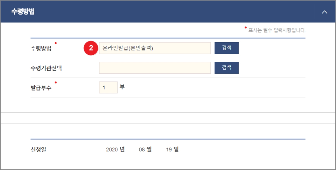 마지막으로 수령방법을 선택합니다. 온라인 발급을 선택하면 바로 출력이 가능합니다. 발급부수를 입력 후 신청을 완료합니다.