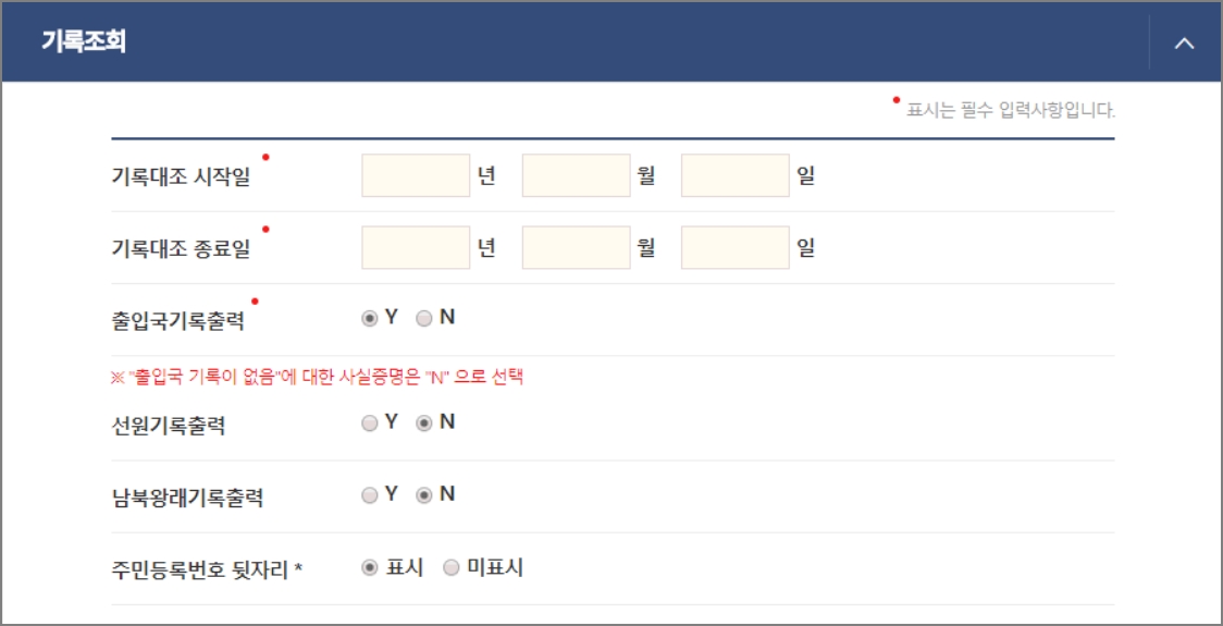 기록대조 시작일부터 종료일까지를 입력합니다. 출입국 기록, 선원 기록, 남북왕래기록 등을 출력할수 있습니다. 주민등록번호 뒷자리 표시 여부 등도 선택이 가능합니다.
