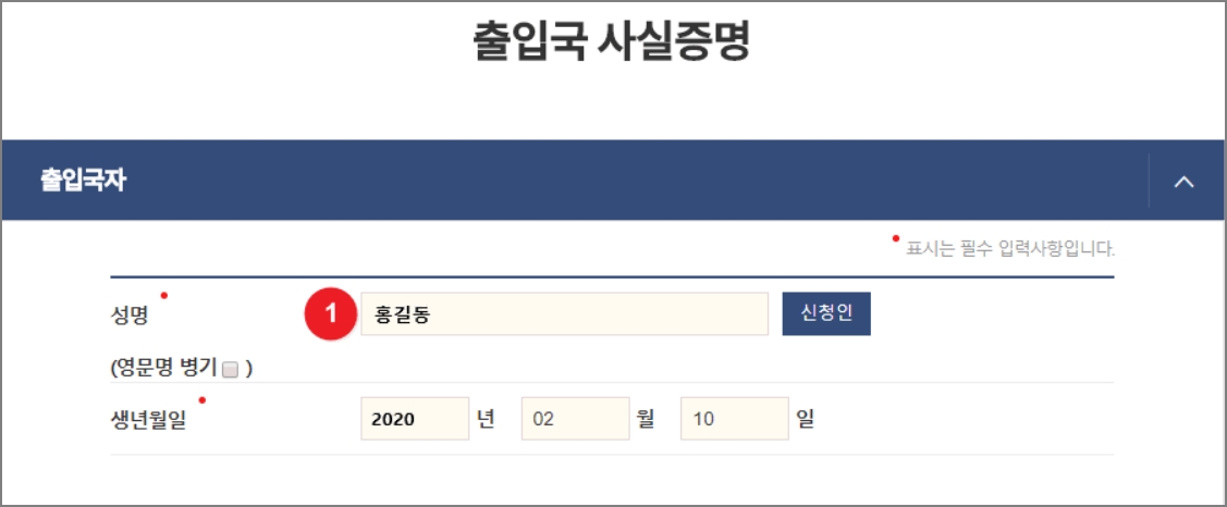 먼저 출입국자 정보를 확인합니다. 출입국자 이름, 생년월일 등 정보는 자동으로 입력이 됩니다.