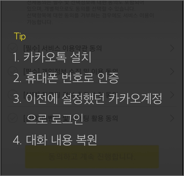 아래의 '주의사항'과 '복원이 불가능한 경우'를 먼저 반드시 읽어보시기 바랍니다. 그렇지 않은 경우 복원이 불가하여 기존 대화내용을 다시 볼수 없을 수 있습니다. 주의사항만 잘 확인하면 이상없이 복원할 수 있습니다.