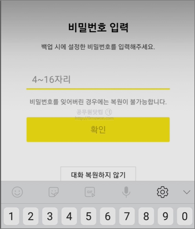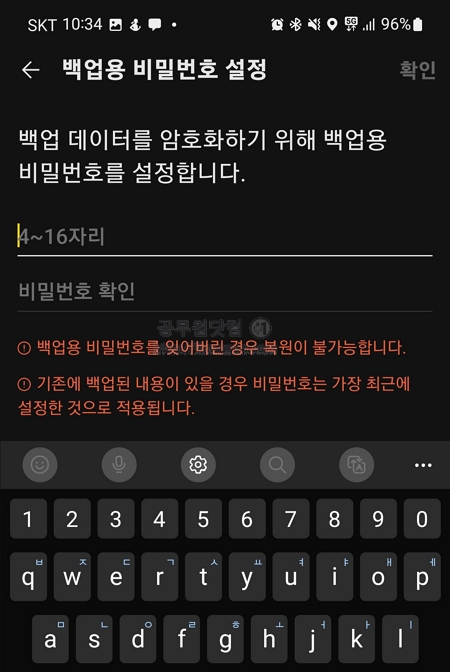 5. 백업 비밀번호 생성 후 확인을 선택합니다. 비밀번호는 4~16자까지 설정이 가능합니다. 비밀번호는 적어두세요. 비밀번호를 모르는 경우 대화를 복원할 수가 없습니다.