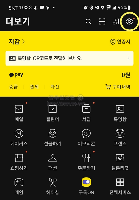 1. 카카오톡 '설정'을 선택합니다. 우측 상단 톱니바퀴 모양 그림이 설정입니다.