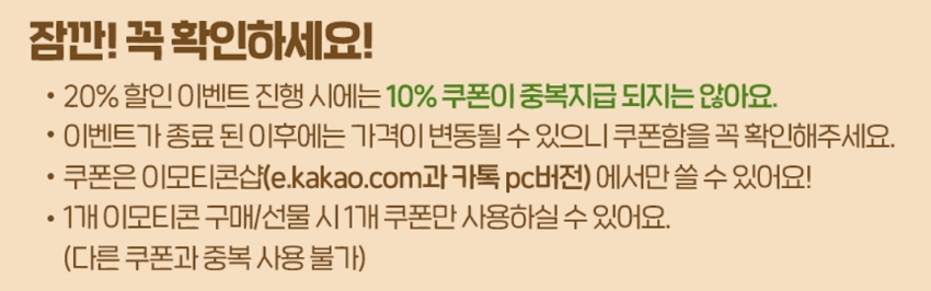 언제나 누구나 모두 할인이 됩니다. 기본 할인은 10%입니다. 가끔 20%를 할 때도 있기는 합니다. 20% 할인 이벤트 진행시에는 10% 할인쿠폰은 중복지급 되지는 않습니다. 쿠폰은 이모티콘샵에서만 사용을 할 수 있습니다.