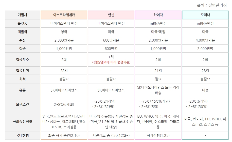 2021년 2월 기준으로 국내에서는 두 가지 종류의 코로나 19 백신이 사용 가능합니다. 아스트라제네카와 화이자입니다. 오늘은 코로나 백신 종류 및 종류별 특성에 대해서 알아보도록 하겠습니다.