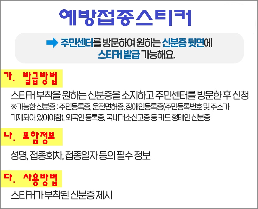 예방접종 스티커는 증명서 휴대나 스마트폰 사용이 어려운 분들에게 좋습니다. 예방접종 스티커는 주민센터를 방문하여 스티커 부착을 원하는 신분증 뒷면에 스티커를 발급받을 수 있습니다.