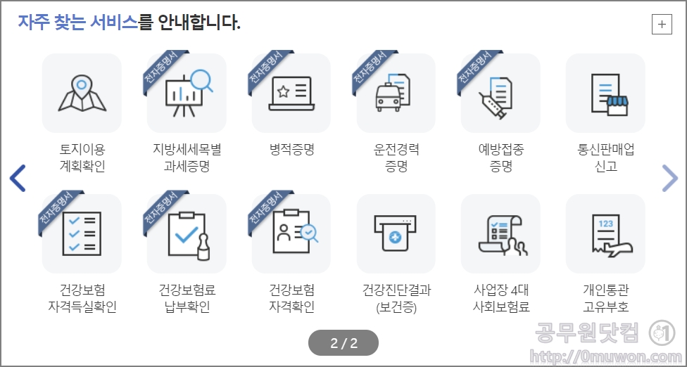 정부24 홈페이지에 보면 중앙에 자주 찾는 서비스가 있습니다. 토지이용계획확인원은 2페이지 있습니다. 토지이용계획확인을 클릭합니다.