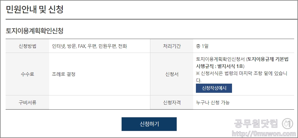 토지이용계획확인신청에 대한 민원안내가 나옵니다. 인터넷, 방문, FAX, 우편, 민원우편, 전화 등으로도 신청이 가능합니다. 누구나 신청을 할수 있는 민원입니다. 토지 소유주가 아니더라도 토지이용확인원을 발급 받을 수 있습니다. 처리기간은 1일입니다. 즉시 민원 인줄 알았는데 생각보다 깁니다.