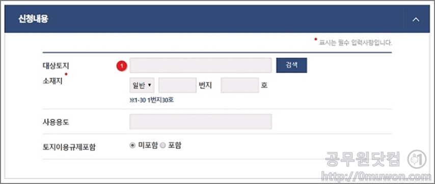 신청하기를 클릭합니다. 확인이 필요한 대상토지 소재지를 입력합니다. 토지이용규제포함이 필요하면 선택을 합니다. 규제내용까지 포함하는 경우 인쇄되는 페이지가 많을 수 있습니다. 꼭 필요하지 않다면 미포함 하시기 바랍니다.