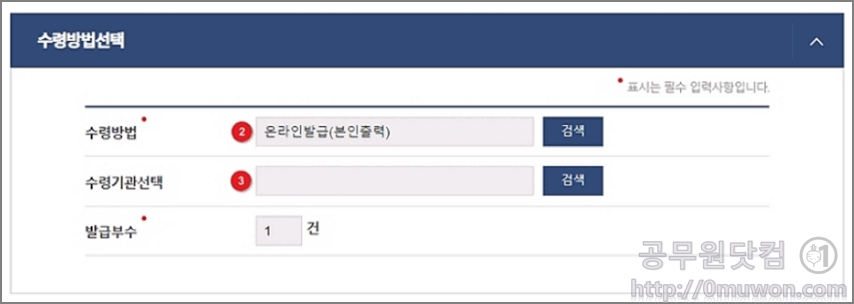 수령방법 및 발급부수를 입력합니다. 수령방법에는 온라인발급(본인출력)을 선택하면 됩니다. 최종적으로 수수료를 납부하면 발급이 완료됩니다.