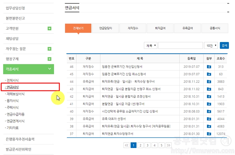 퇴직유족 연금 일시금 퇴직수당 신청서, 분할지급 선청구 취소 신청서, 분할지급 조정신청서 등 다운 받을 수 있습니다.