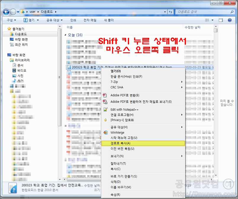 Shift 키를 누르지 않은 상태에서는 '경로로 복사' 메뉴가 활성화 되지 않습니다. 반드시 Shift키를 누른 상태에서 마우스 오른쪽을 클릭하여야 합니다.