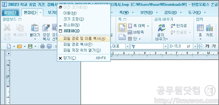 ① 한글(hwp) : 파일 상단에서 오른쪽 클릭 후 ‘파일 경로 및 이름 복사’