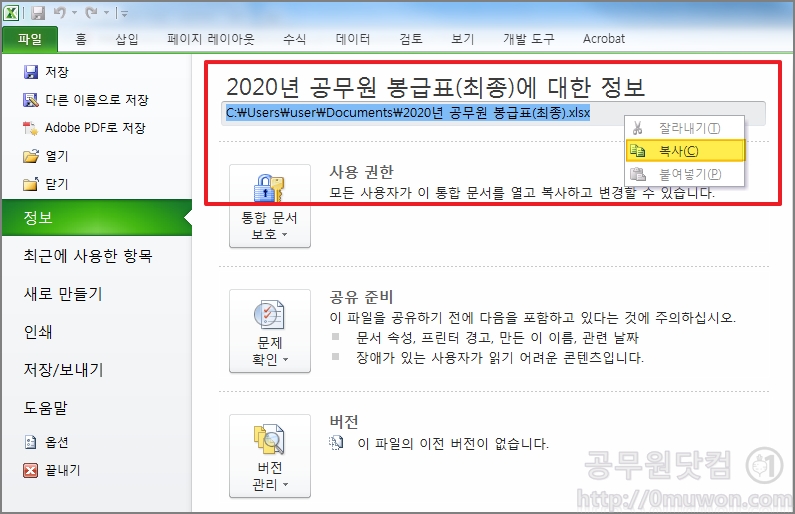 ② 엑셀 등 오피스 : 파일 > 정보 > 파일경로 복사