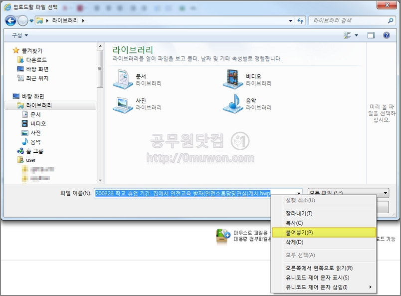 파일첨부를 눌러 업로드할 파일 선택 창이 뜨면, 파일이름에서 마우스 오른쪽 버튼을 클릭합니다. 붙여넣기를 클릭하면 그림과 같이 파일이름과 경로가 복사가 됩니다. 또는 Ctrl+V로 붙여넣을 수 있습니다. 확인 버튼을 클릭하면 바로 파일이 업로드 됩니다. 간단하고 쉽게 파일 첨부가 됩니다.