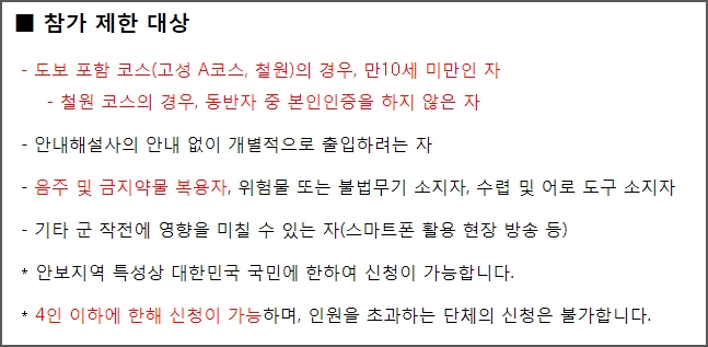 참가제한이 있습니다. 만 10세 미만, 안내해설사 없이 개별적으로 출입하려는 자, 음주 및 금지약물 복용자 등은 제한이 됩니다. 또한 4인 이하에 한해 신청이 가능하며, 인원을 초과하는 단체의 신청은 불가합니다.