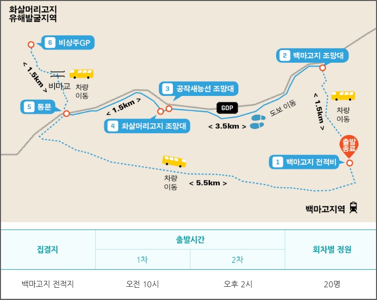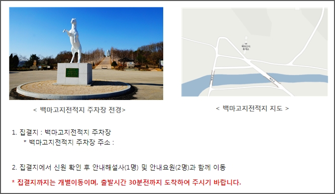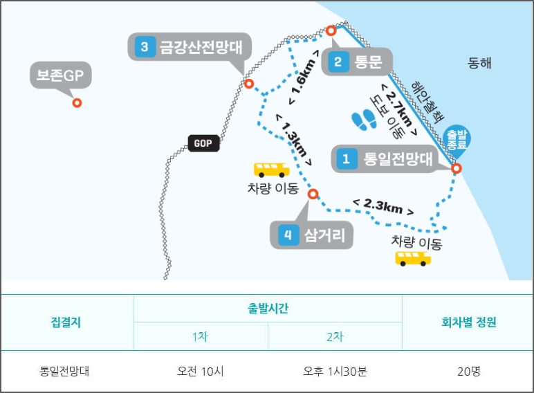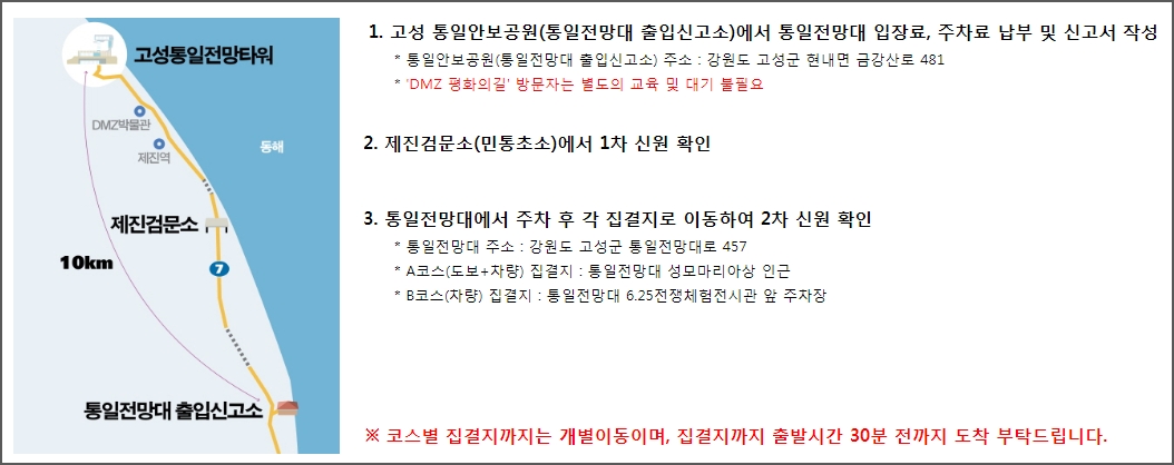 코스별로 집겹지가 있습니다. 철원구간은 통일구간은 백마고지 전적지, 고성구간은 통일전망대입니다. 집결지 정보입니다. 집결지까지는 개별이동이며, 출발시간 30분전까지 도착하여야 합니다.