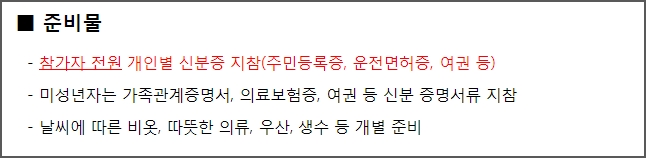 평화의 길 참가자 전원은 주민등록증, 운전면허증, 여권 등 개인별 신분증을 가지고 오셔야 합니다. 신분증이 없는 미성년자는 가족관계증명서, 의료보험증 등 신분을 증명할 수 있는 서류를 준비하여야 합니다.