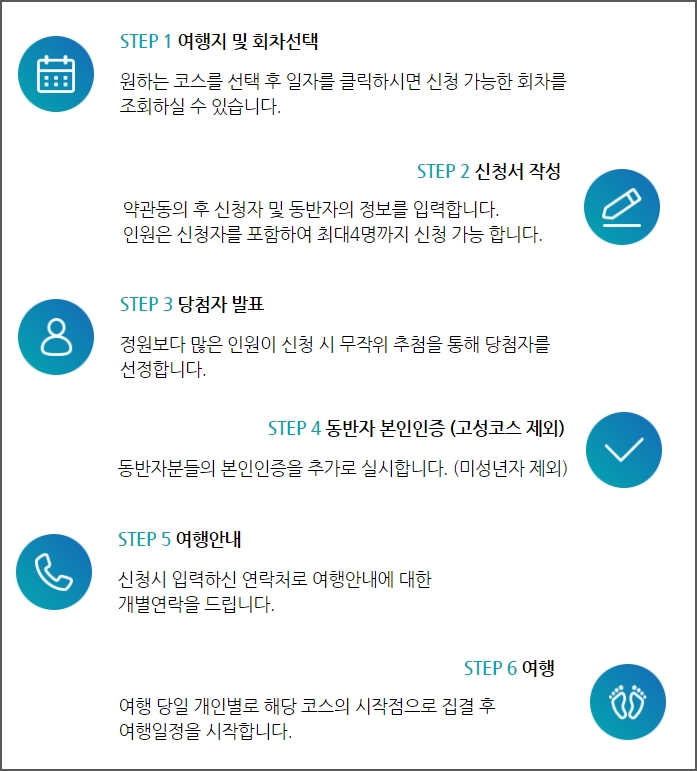 평화의길 신청방법입니다. 원하는 코스를 선택 후 일자를 클릭하시면 신청가능한 회차를 조회할 수 있습니다. 약관동의 후 신청자 및 동반자의 정보를 입력합니다. 신청자 포함 최대 4명까지 신청이 가능합니다. 정원보다 신청이 많은 경우에는 추첨을 통해 선정이 됩니다. <평화의 길 - 두루누비 바로가기>