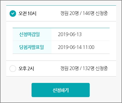 ▼ 원하는 시간은 선택 후 신청하기를 클릭합니다. 신청인원, 신청마감일, 당첨자발표일을 확인하세요.