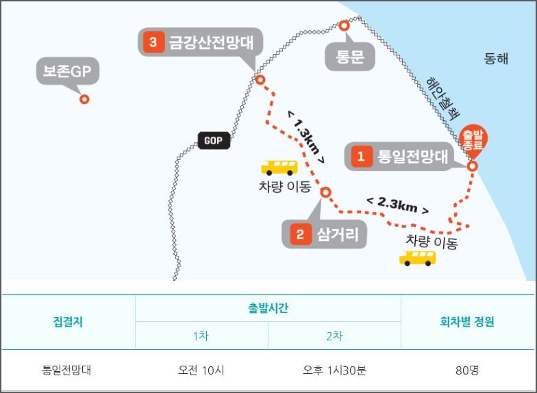 고성B코스도 통일전망대에서 출발합니다. 다른 코스와는 달리 차량을 이용하는 코스입니다. 오전10시, 오후 1시30분에 출발을 하며 회차별 정원은 80명입니다. 7.2키로미터이며, 1시간30분정도 소요가 됩니다. 금강산과 해금강을 가장 가까운곳에서 볼수 있습니다.