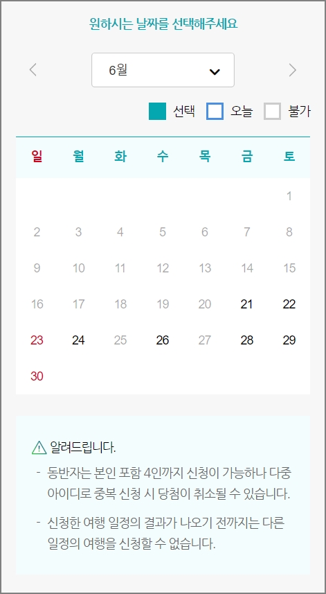 ▼ 원하는 날짜를 선택하세요. 동반자는 최대 4인까지 신청이 가능합니다. 다중아이디로 중복신청 시 당첨이 취소될수 도 있다고 합니다. 신청한 여행일정의 결과가 나오기 전까지느 다른 일정은 신청할 수 없습니다. 만약 철원코스를 신청하였다면 그 결과가 나올때까지 고성A코스와 고성B코스를 신청할 수 없습니다.
