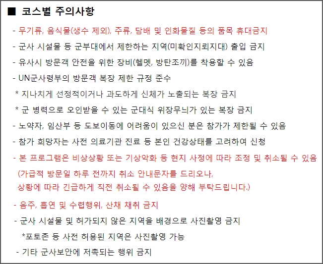 비상상황 또는 기상악화 등 현지 사정에 따라 일정 조정 및 취소될 수 있다고 합니다. 방문일 하루 전까지 취소 안내문자를 준다고 하나, 출발 전 미리 확인해보는게 좋을 듯 합니다. 군사 시설물 및 허가되지 않은 지역을 배경으로 사진촬영도 할수 없습니다. 포토존 등 허가된 지역에서 사진을 찍으셔야 합니다.