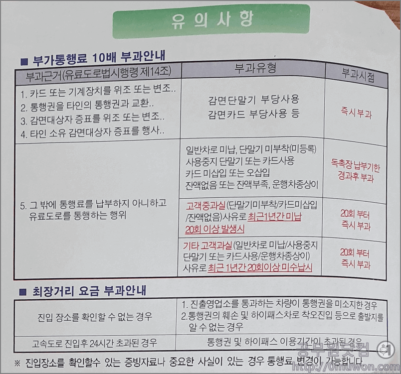 ① 일반차로 미납, 단말기 미부착(미등록) 사용중지 단말기 또는 카드사용 카드 미삽입 또는 오삽입 잔액없음 또는 잔액부족, 운행차량이 다른 경우에는 먼저 납부고지서가 나오고 독촉장 납부기한이 경과되면 10배가 부과됩니다.
