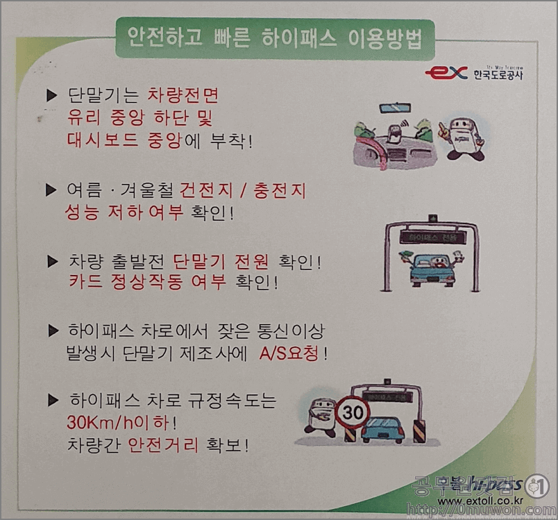 한국도로공사에서 알려드리는 안전하고 빠른 하이패스 이용방법입니다. 하이패스 요금이 사용자 과실없이 정상적으로 납부될 수 있도록 하는 방법입니다.