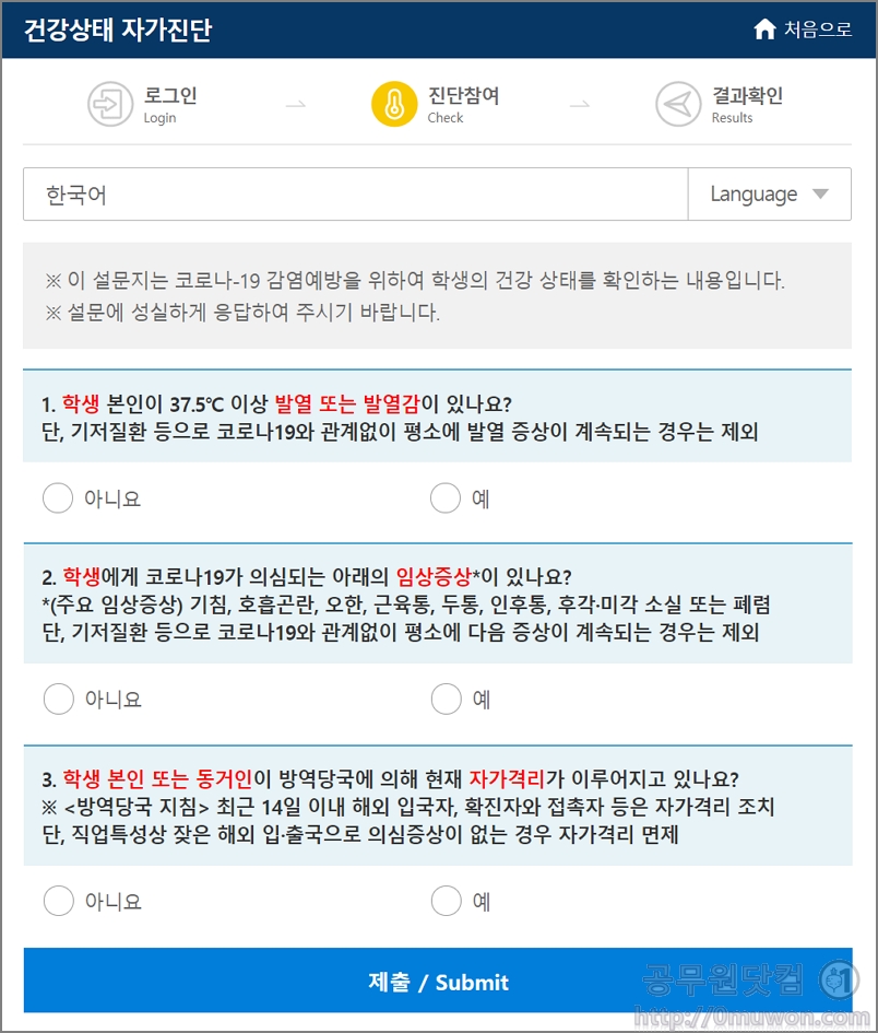6. 건강상태 자가진단을 합니다. 설문에 성실하게 응답하면 됩니다. 학생의 발열 또는 발열감, 임상증상, 자가격리 여부 등에 대한 설문에 답을 하면 됩니다. 다문화 가정 등을 위해 언어를 선택하는 항목이 나오는데 영어, 일본어, 중국어, 베트남어, 러시아어 등 총 5개 국어가 지원됩니다.