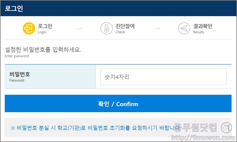 4. 비밀번호를 입력합니다. 설정한 비밀번호를 입력하세요. 비밀번호 분실 시에는 학교로 비밀번호 초기화를 요청하여야 합니다. 비밀번호를 모르면 자가진단을 할수가 없습니다.