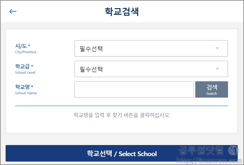 3. 학교검색을 합니다. 시도, 학교급, 학교명을 검색하여 입력을 합니다.