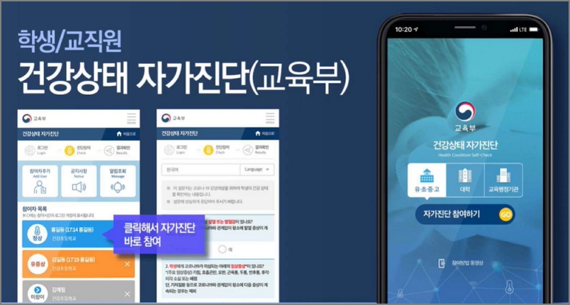 건강상태 자가진단은 코로나19 감염병으로부터 학생과 교직원을 보호하기 위해 자기 스스로 건강상태를 진단하고 예방할 수 있도록 도와줍니다. 학생본인이 하는 것이 원칙이지만 부모가 대신해줘도 됩니다.