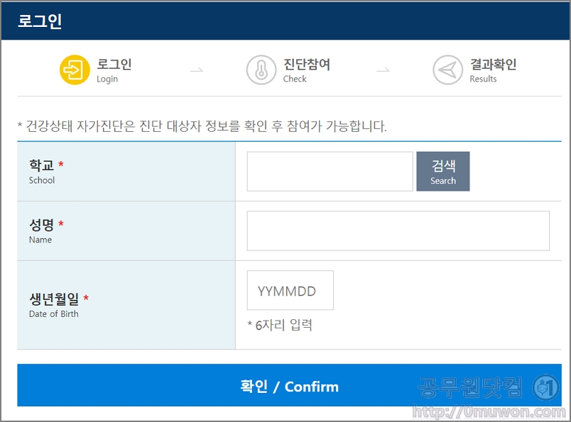2. 로그인을 합니다. 건강상태 자가진단은 진단 대상자 정보를 확인 후 참여가 가능합니다. 학교, 성명, 생년월일 6자리를 입력합니다.