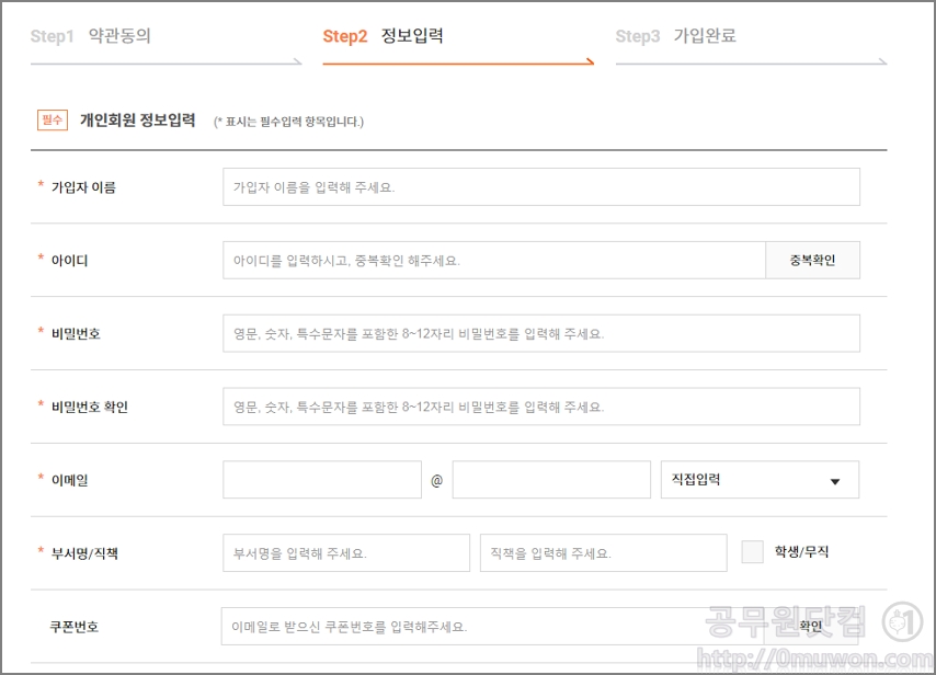 개인회원 정보를 입력합니다. 가입자 이름, 아이디, 비밀번호, 이메일 주소 등을 입력합니다.