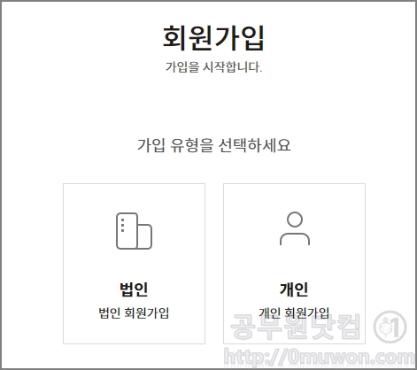 회원가입을 시작합니다. 회원 가입유형은 크게 두가지 입니다. 법인과 개인이 회원으로 가입할 수 있습니다.