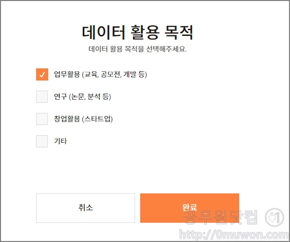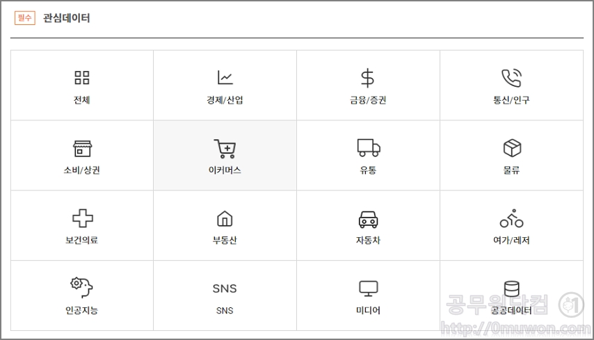 관심이 있는 데이터 분야도 선택을 해야 합니다. 전체를 선택할 수도 있습니다. 경제/산업, 금융/증권, 통신/인구, 소비/상권, 이커머스, 유통, 물류, 보건의료, 부동산, 자동차, 여가/레저, 인공지능, SNS, 미디어, 공공테이터에서 선택이 가능합니다.