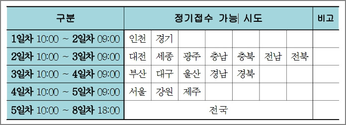 정기접수는 시도별 해당 접수일에만 접수 가능합니다. 대상 지역은 일자별로 인천, 경기, 대전, 세종, 광주, 충남, 충북 등 총 17개 시군도별로 구분되어 있습니다.