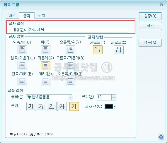 글자 탭을 선택합니다. 글저 설정에서 내용을 원하는 제목으로 변경을 합니다. 글자방향, 글자정렬, 글꼴도 바꿀수가 있습니다.