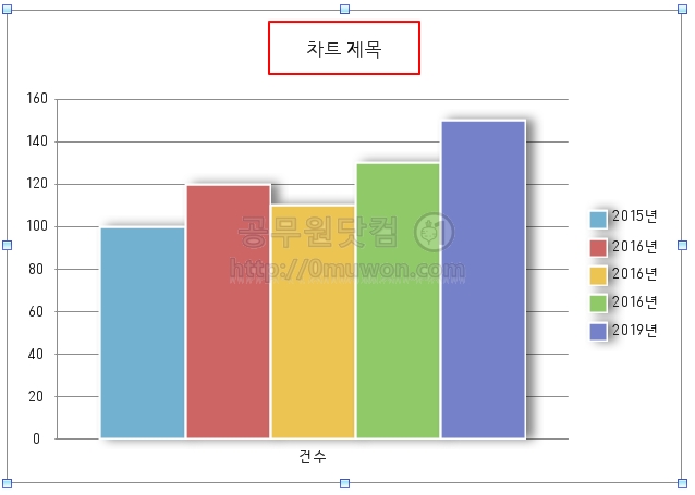 제목은 '연도별 건수' 로 변경하였습니다. 범례가 필요 없는 분은 '범례 > 범례 표시 안함'을 클릭하면 됩니다. 차트에 원하는 값을 입력하려면 '글상자'를 이용하여야 합니다. '입력 > 개체 > 글상자'를 선택 후 문구를 입력합니다.