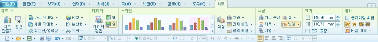만들어진 차트가 마음에 들지 않는다면 엑셀처럼 다양한 형태로 꾸밀 수 있습니다. 차트를 클릭하면 한글 상단메뉴에 '차트' 메뉴가 생성이 됩니다.
