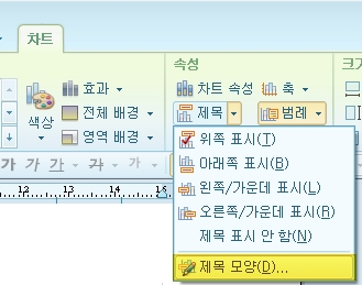 원하는 디자인으로 변경을 하였으면 제목을 넣어 보겠습니다. 제목을 입력하는 순서는 '제목 > 제목모양 > 글자' 입니다. 먼저 차트를 선택한 상태에서 상단의 '제목'을 클릭합니다. 제목은 위쪽, 아래쪽, 왼쪽가운데, 오른쪽가운데 선택이 가능합니다.