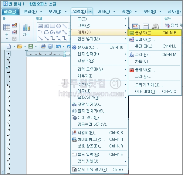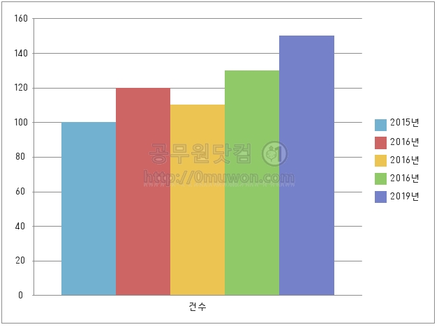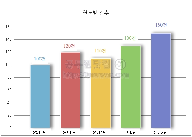 제목은 '연도별 건수' 로 변경하였습니다. 범례가 필요 없는 분은 '범례 > 범례 표시 안함'을 클릭하면 됩니다. 차트에 원하는 값을 입력하려면 '글상자'를 이용하여야 합니다. '입력 > 개체 > 글상자'를 선택 후 문구를 입력합니다.