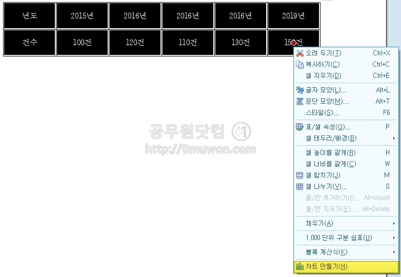 만든 표를 블록설정하고 마우스 우 클릭 후 차트 만들기(H)를 선택합니다.