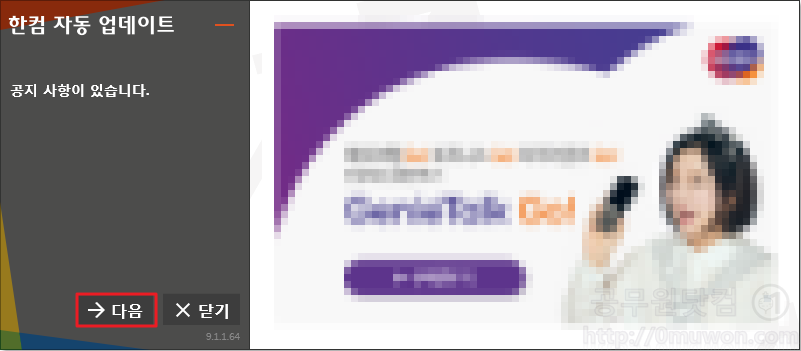 ▼ 한컴 자동 업데이트를 진행합니다. 다음 버튼을 클릭합니다.