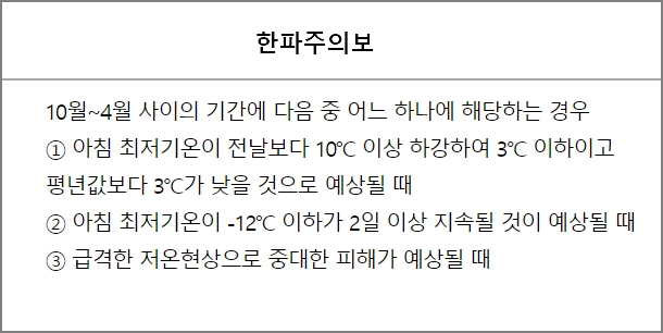 - 아침 최저기온이 전날보다 15℃ 이상 하강하여 3℃ 이하이고 평년값보다 3℃가 낮을 것으로 예상될 때