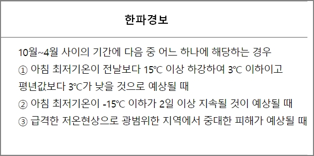 - 급격한 저온현상으로 광범위한 지역에서 중대한 피해가 예상될 때