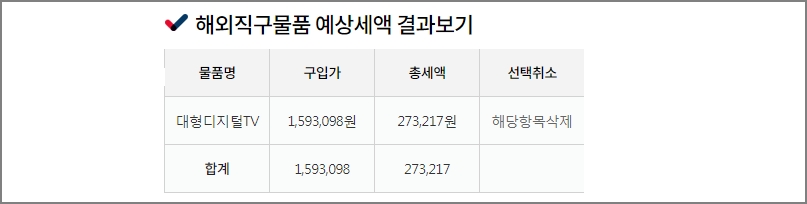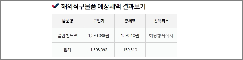 일반핸드백을 구입하는 경우 예상세액입니다. 제품가격, 미국내 배송료, 국제배송료가 위와 동일하다가 가정합니다. 구입가는 대형디지털TV와 같이 1,593,098원입니다. 하지만, 총세액은 159,310원입니다. 디지털TV보다 예상세액이 적다는 것을 알수 있습니다.